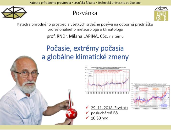 Katedra prírodného prostredia všetkých srdečne pozýva na odbornú prednášku profesionálneho meteorológa a klimatológa prof. RNDr. Milana LAPINA, CSc. "Počasie, extrémy počasia a globálne klimatické zmeny".
